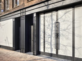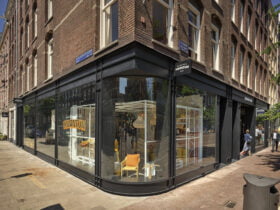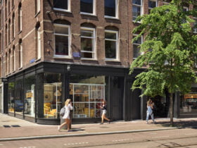 Een technisch hoogstandje door het fraai gebogen glas van de winkelpui. Het patroon van oorspronkelijke glas-in-lood bovenlichten is verwerkt in stalen gevelcassettes en doorgevoerd tot in het detail van de deurgrepen.